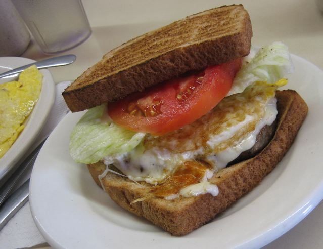 Speak up or your sandwich will be simply bread and sausage. Don’t pass up the lubricating egg, crisp lettuce and not-too-bad tomato slice. Oh, and mayonnaise to keep the fat ratio UP. This sandwich slides down easy.