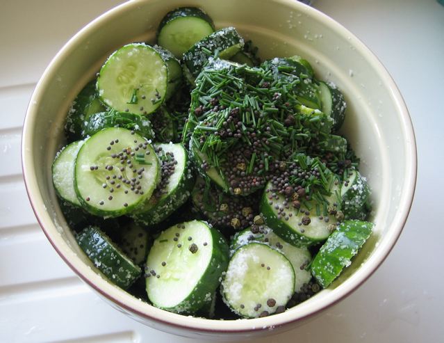 Water, white vinegar, salt, chives (or dill – didn’t have any), garlic, peppercorns and mustard seeds.