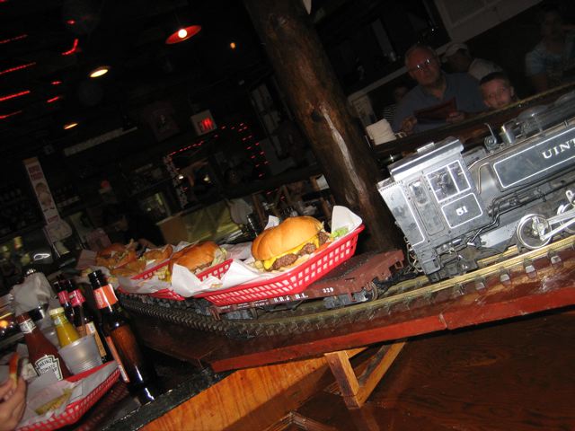 My perch perched at PC Junction in Door County, Wisconsin, where your lunch basket perches on a model flatcar and is delivered via rail.