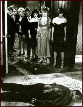 (l-r)Colonel Mustard, Mister Green, The French Maid, Professor Plum, Miss Scarlet, Miss Peacock, Miss White