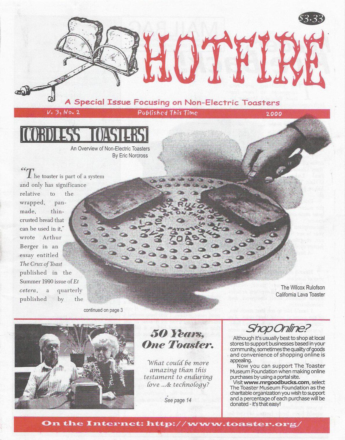 As the last thread tore free, a thought formed…maybe I should not be ripping the cover off this highly collectible toasterzine! It’s a Special Issue. Focusing on Non-Electric Toasters! The words that gave me pause were “Published This Time.” Ya know what, I don’t believe I have received an issue since. V.3, No.2 in 3 beauteous hues was delivered in ’00.