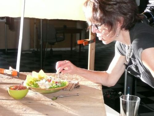 My job is real interesting. Lots of nice edible perks. And I never wear pantyhose. Course no one much does anymore these days. From what I can tell on the streets, office workers now go to work in their flip flops. I’m an industrial clog girl. Strap on that apron and I’m ready to go. Oh, and some of that expensive Dr. Hauschka lipstick. (One stop shopping. I get it at Whole Foods. Too bad they don’t sell underwear and socks there, too.) Someone forgot to style me before they snapped this pic.