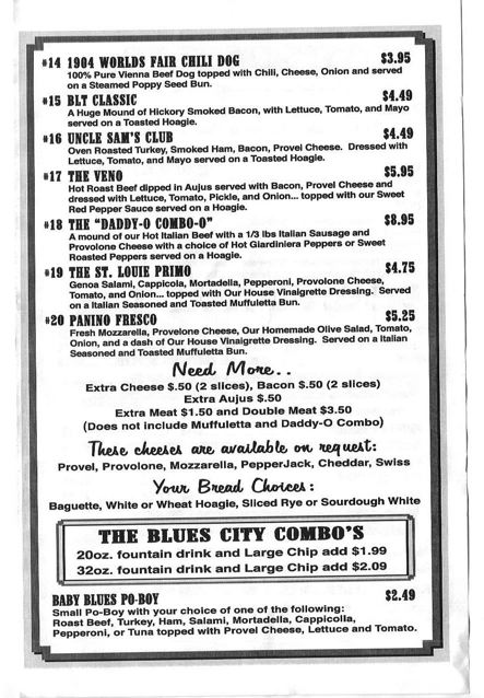 Hey Snack…a couple suggestions..try to make it down to Blues City Deli (best sandwich in the city). I recomend the Benton Park Poorboy or the Chicken Shack Ranch…St. Louis Blues History all over the walls and the owner Vince is an ex-muscian but more importantly..a hell of a guy..Mention your blog to him he will be grateful..Vinnie is a great guy….