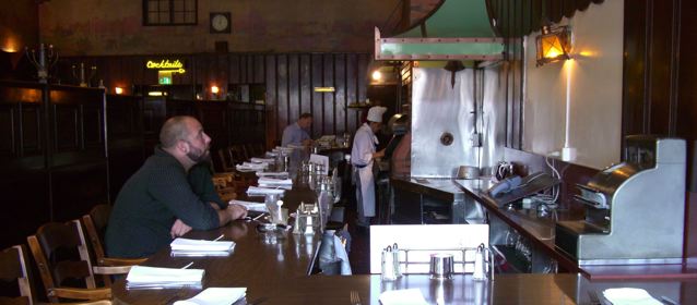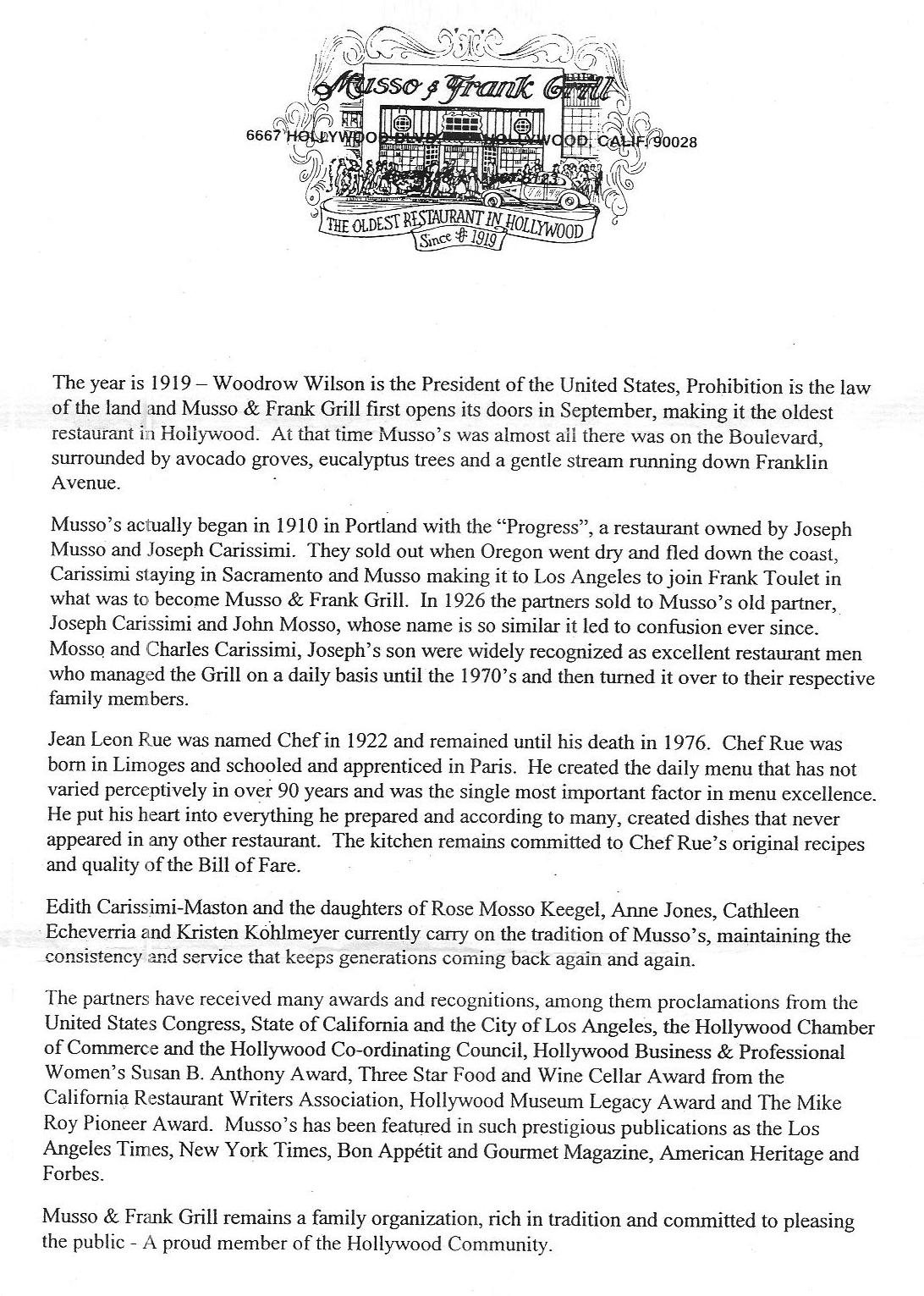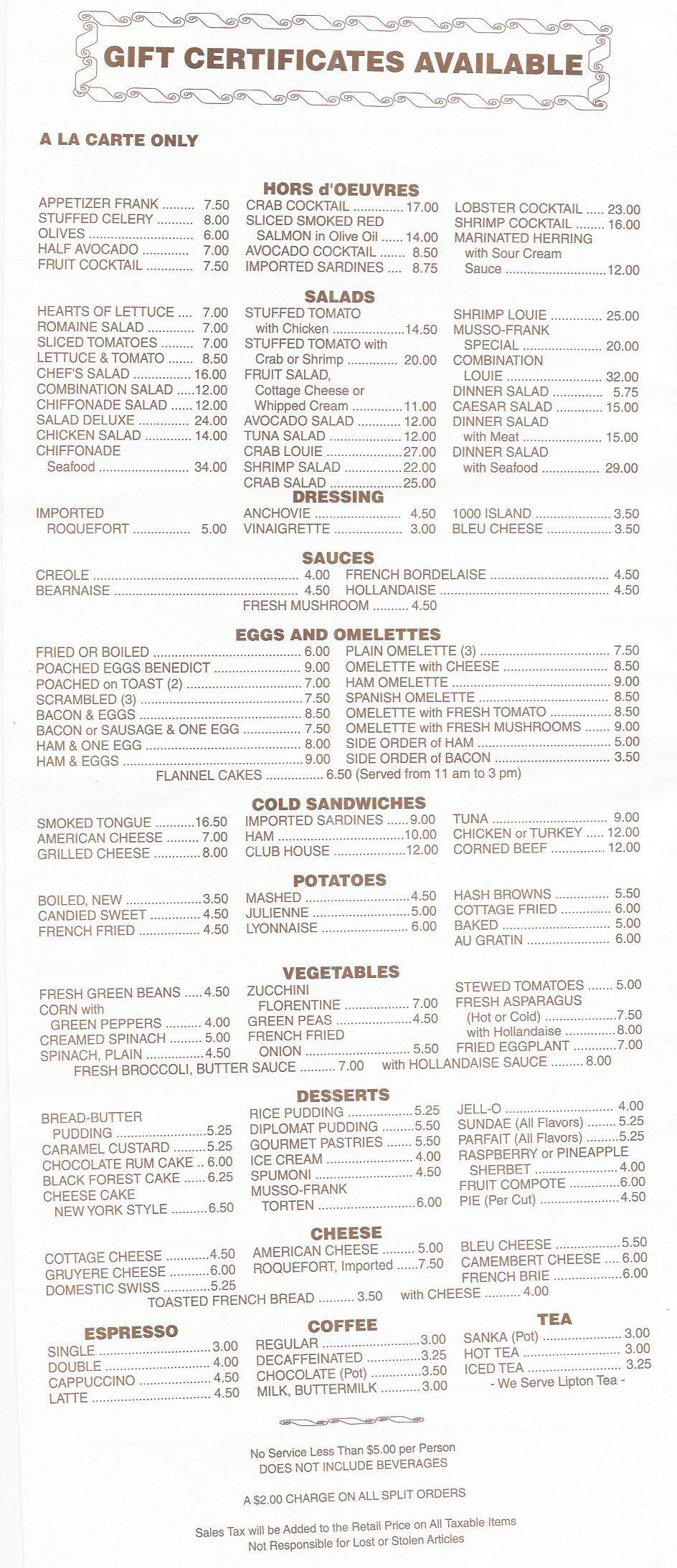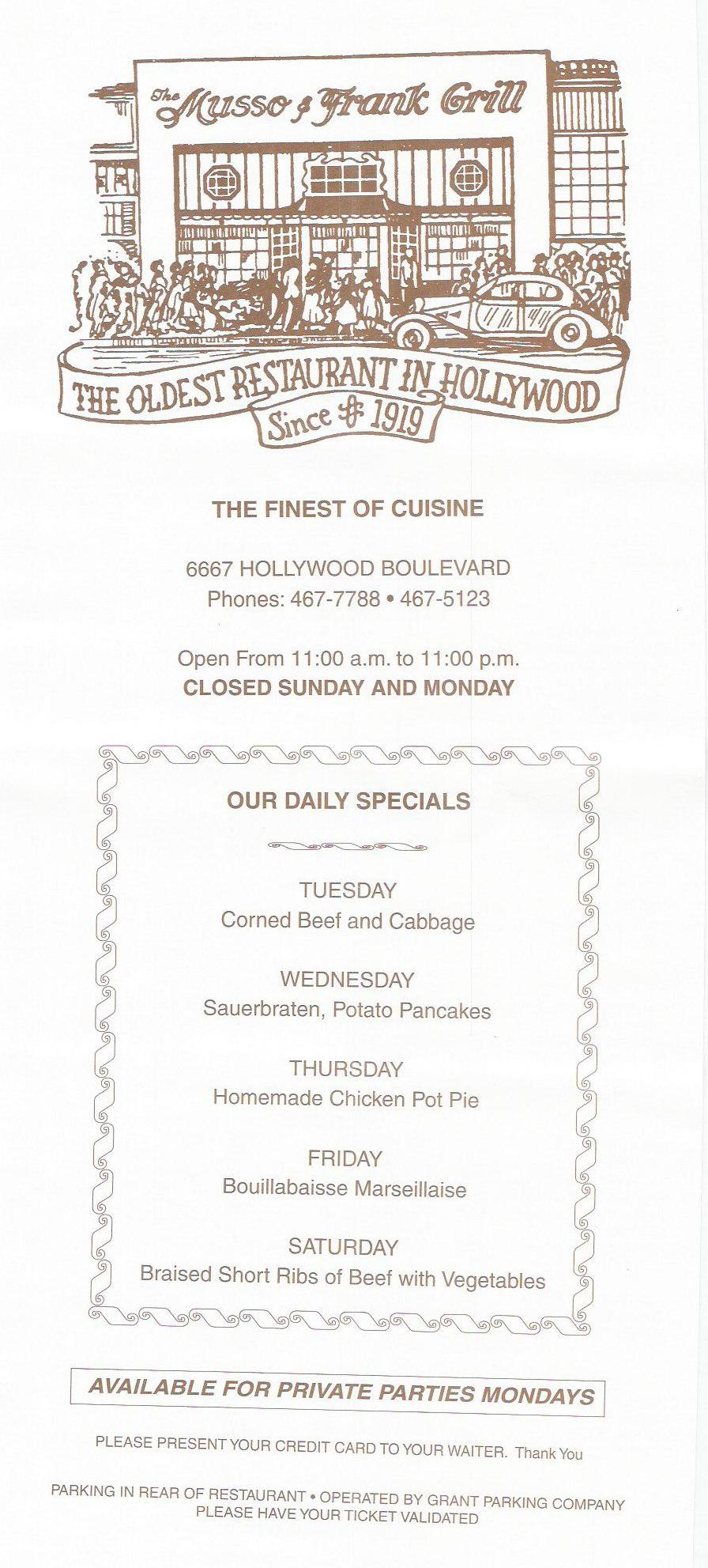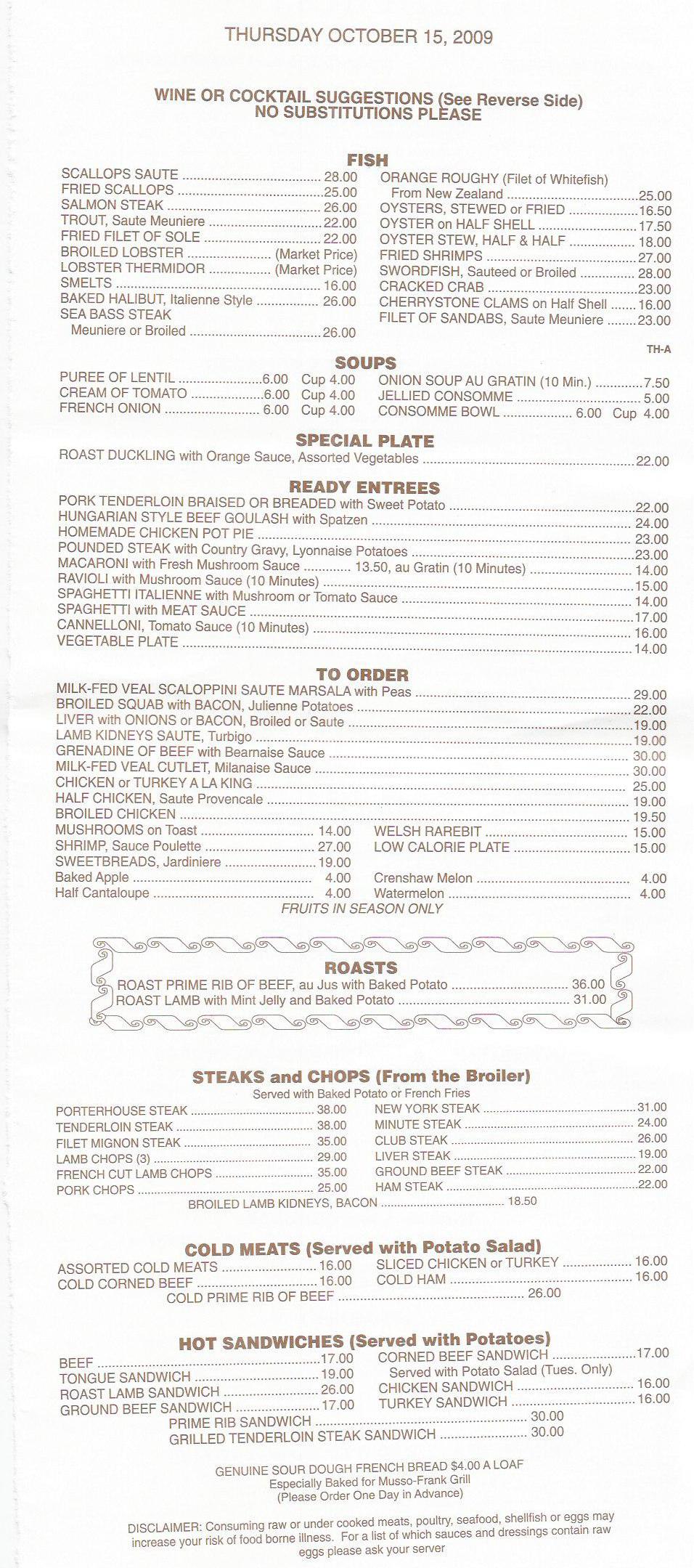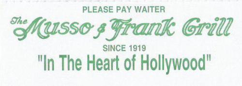 I first read about Musso & Frank Grill in Roadfood, the 1992 edition, and, on my imaginary United States map, there has been a red pushpin on 6667 Hollywood Boulevard ever since. Last October the mighty fine boyfriend and I stayed for a couple nights at a schwanky LA hotel, the Roosevelt,