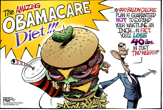Nate Beeler, cartoonist for the conservative free paper, The Examiner, draws an enticing hamburger – a quadruple decker in fact. But he’s less impressed with the Democratic health care plan that he has the hamburger standing in for.