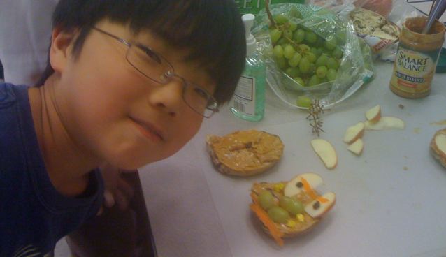There were “stations” in the all-purpose room, manned by parents and teachers and other people who are not bothered by chaos and cacophany. We learned stuff, such as, uh, something to do with friction and a cd spinning on a table, and, uh, uh, oh I dunno. Ask a 4th grader. Little sponges, they are. Not like me, mind made of impenetrable concrete. We made food faces, don’t ask me why, although I was hungry so it worked out fine. Broad strokes, don’t you know. They get the drift – food, earth, friction, earth, reuse, reduce, recyle, earth, chaos and cacophany, earth. Connecting the dots is something kids seem to do without question. Big and little leaps, without stuntmen.