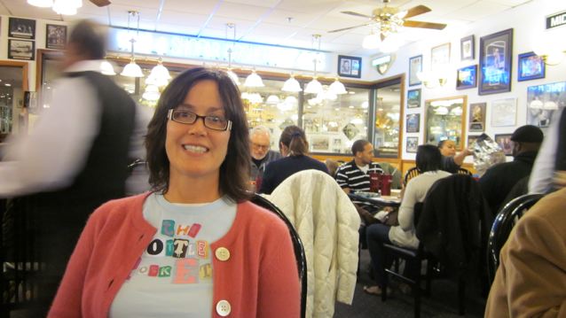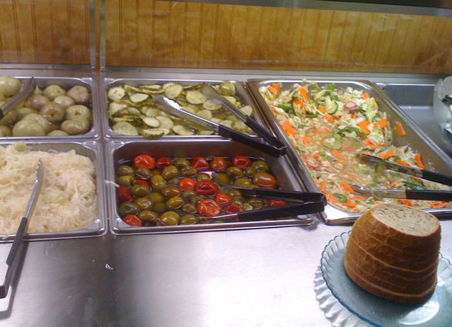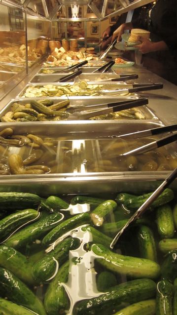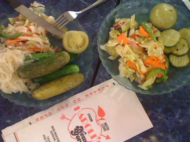 3. Though I avoided the mountain sandwich, I had a tiny-in-comparison (aka normal-sized) grilled cheese, and ate a lot of the amusingly-but-aptly-named “health salad” and one half of a sour green tomato from the pickle bar. Yum.