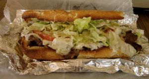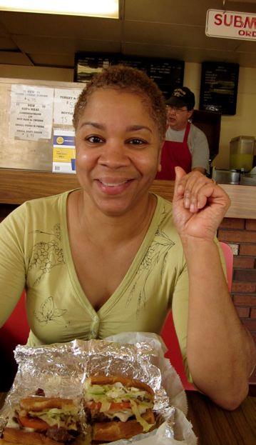 Just before we received our mushroom cheesesteaks with everything Melissa said, “I have a thing about crumbs.” Uh oh. I thing about crumbs. The bread was toasted crunchy. Crackin’. She ate it, neatly. Admirably neatly.