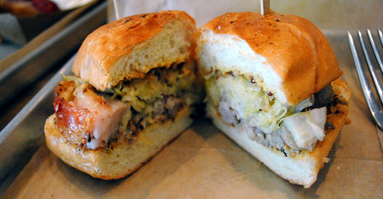 We have eaten some sandwiches together. I have snapshots in my brain. Hipsto-glamour-matic snapshots. Next time I get to LA, maybe she will pick me up at LAX and take us to a place where sweetbreads proxy for chicken wings. Huh? That’s a leap I can make with a running start. Fly right over the plebian stuff of everyday good enough and soar galore to…huh? really? sweetbreads on a Buffalo Chicken Sandwich. Middle of the country, rejoice! You are released from the tyranny of bones/skin/hotsauce. Wings no more. Rejoice!