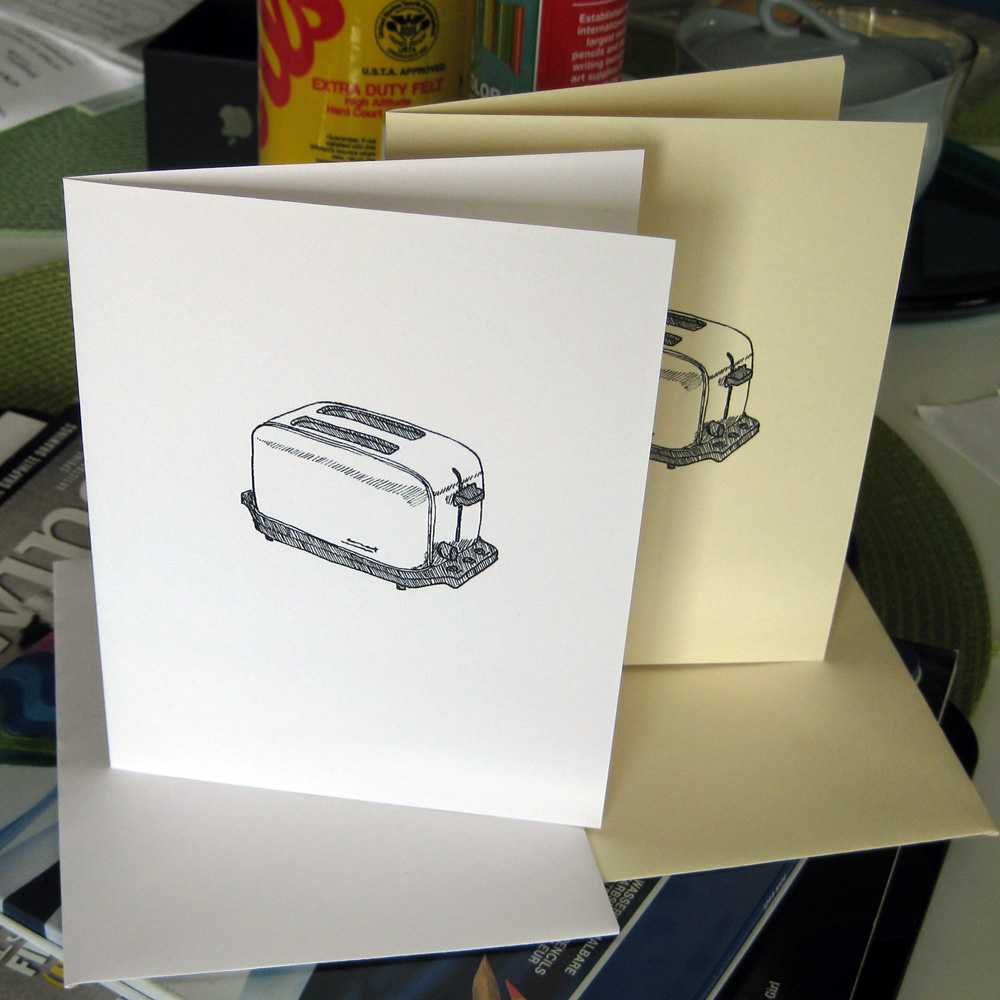 If you’ve looked at the other illustration note cards in my shop, you may have noticed that, over the years, Lisa has commissioned quite a few illustrations from me to adorn blank note cards. To thank her, I did a drawing of an item that is close to her heart (i.e. personally iconic): a toaster.