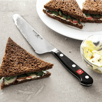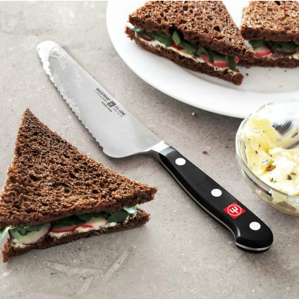 Sporting a wide blade that tapers gently at the end, the new Classic Junior Super Slicer features a razor-sharp serrated edge that cleanly slices through the thickest sandwich or panini without tearing or crushing. Perfectly balanced and designed with an offset handle for knuckle clearance on the cutting board, the smaller 5 1/2-inch blade is the perfect size for effortlessly slicing sandwich bread, cheese, as well as tomatoes and other foods with a hard exterior and delicate interior.