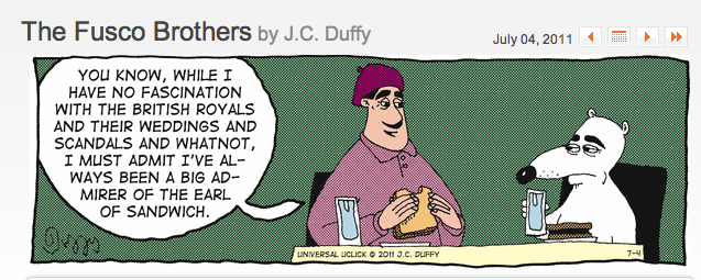 1. There are a FEW reasons this is funny, not the least of which is he’s talking to a bear or some other animal that is eating a sandwich, and who doesn’t seem at all impressed with his comment. The joke is ironic, and thus funny because the Earl is a royal, of course, and the fact(?) that he invented the sandwich would be the only reason this guy is an admirer of a royal. Your unfunny jokes are ironic, too, because we’re expecting them to make sense, but they don’t, so we laugh. Haven’t had the chance to use my college study of Freud’s great theories about comedy and laughter in a long time! (http://en.wikipedia.org/wiki/Laughter)