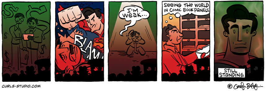 I did this Curls strip about the play and was inspired by the colors and the character of Jerry Siegel, the co-creator of Superman. If you look close, you’ll be able to see Curls, Toast, and Turtle Neck enjoying the play, Mystery Science Theater 3000 style.