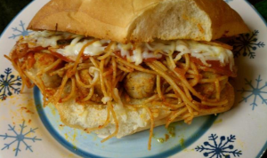Funny thing is, when I google “Spaghetti Sub” or “Spaghetti Submarine”, there is virtually nothing. “Spaghetti Sandwich”? Whole nuther meatball. Everywhere. There. Here pretty soon.