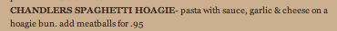 Killing me that I have never seen, nor eaten a spaghetti hoagie. Next best thing – NOT! –  is looking around online. Cold spaghetti comfort. I did it anyway and found  Mickey’s Pizza where  is on the menu.