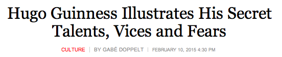 Hugo Guinness, the English-born, Brooklyn-based artist, fashion collaborator and voice actor. Mr. Guiness’ fine-lined drawings echo the work he is known for: coveted lino cut prints, drawings and paintings. He trades the paintbrush for the pen for his ongoing collaboration with the film director Wes Anderson. Guinness’s own home was the model for the Tenenbaum family’s dollhouse-like mansion. He is also a writing partner with Anderson, and the duo recently received an Oscar nomination for Best Original Screenplay for “The Grand Budapest Hotel.”
