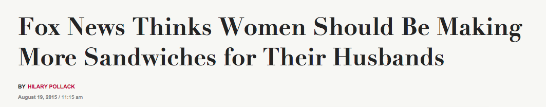 A few weeks ago, Tantaros received flak for recommending that women make sandwiches for their men after sex. “After you engage in a little horizontal hula, make him a sandwich,” she argued. “That’s not called the 1950s! That’s called kindness!”