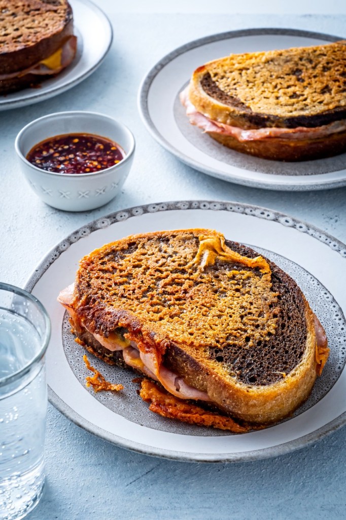 With a lovely balance of sweet and tart, J. J. Goode, recollecting his father’s fathering – and musings on his own parenting puzzles – created this sandwich. I love it for a quick and deeply satisfying supper. The cheese is on the outside, people, all crunched up into frico, and on the inside, too, of course.