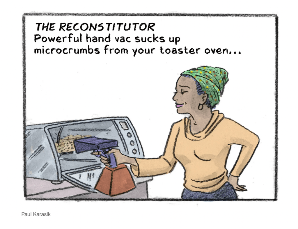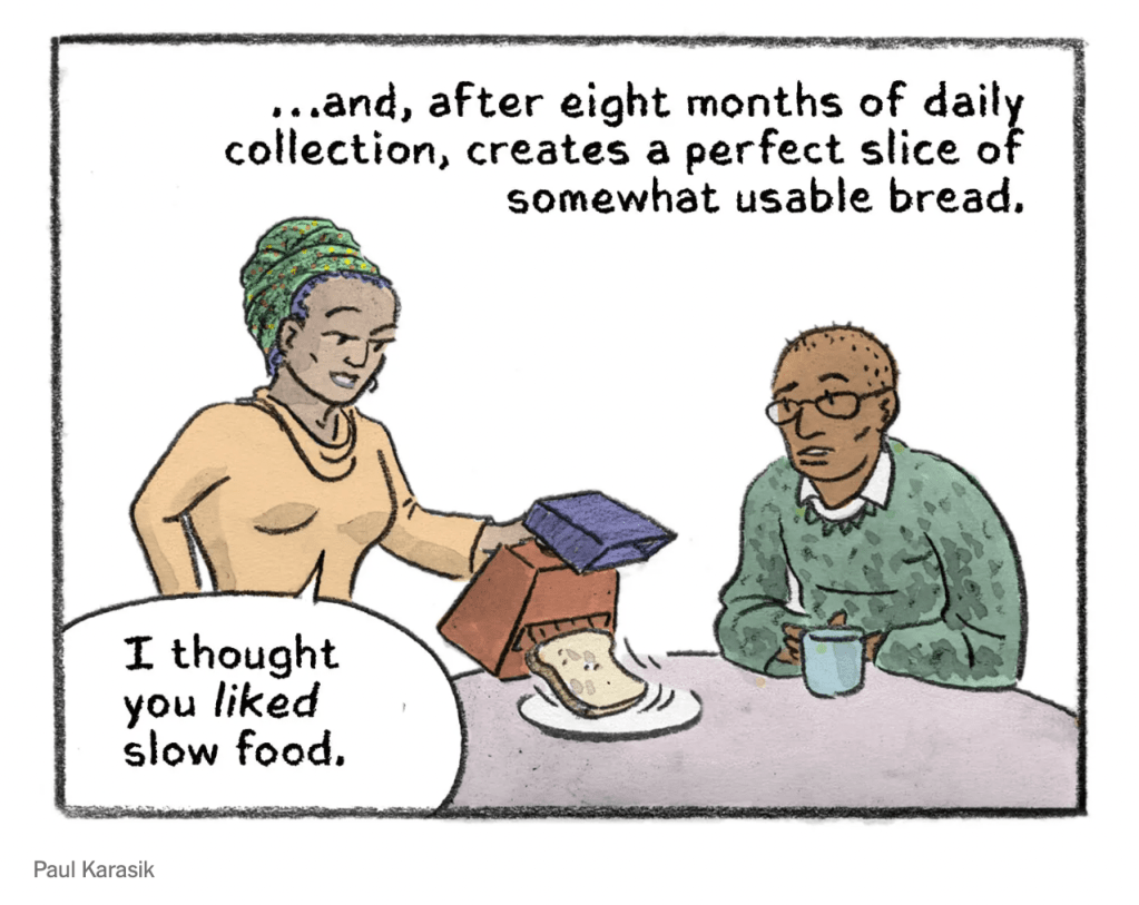 Boo hoo hoo, I am crying into my toast over the New York Times choice to NOT choose comics for the food section going forward. That means: in the future, no more, anymore, from now on, henceforth. Now then (a surprisingly prosaic oxymoron), sadness is upon us both in the present, and upcoming. Soon the present will the the “then”, the past, making “now then” the master of all time. Now, then, and to come. Cold toast for you!