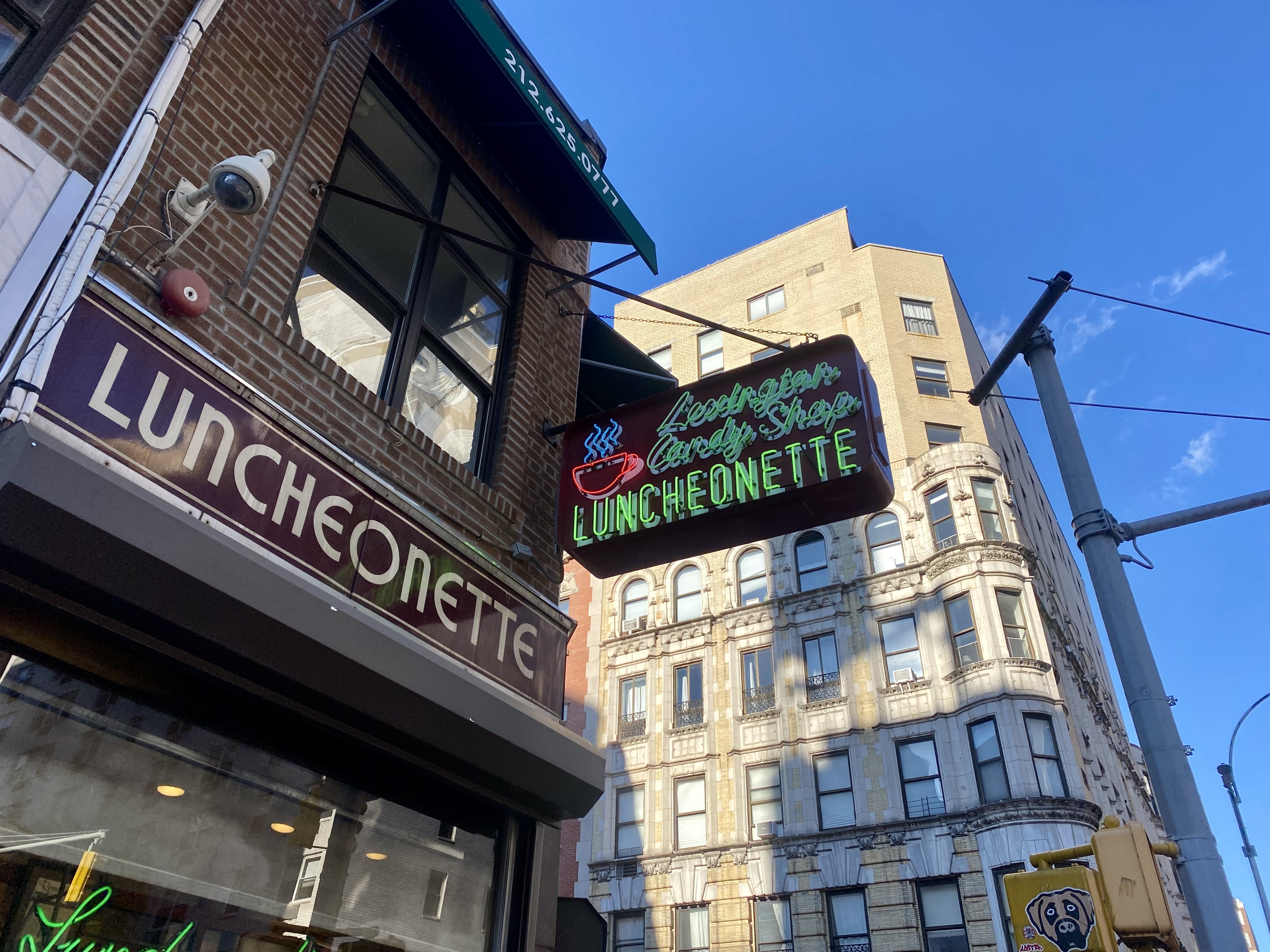 Up on the east side, Lexington Candy Shop, has not enrolled in “How to Be Known to All” from the Universal-ity of Disney. The line out the door was long. And needed a manager, who was present, friendly and imposing, long apron wrapped majestically around his in-charge frame. We waited. While we waited we could see in. Candy we did not see. Milkshakes, burgers, pink formica table-tops, cozy booths occupied by hipsters in the know and non-hipsters in the know-more, a sacred place. We could see it. We waited silently.