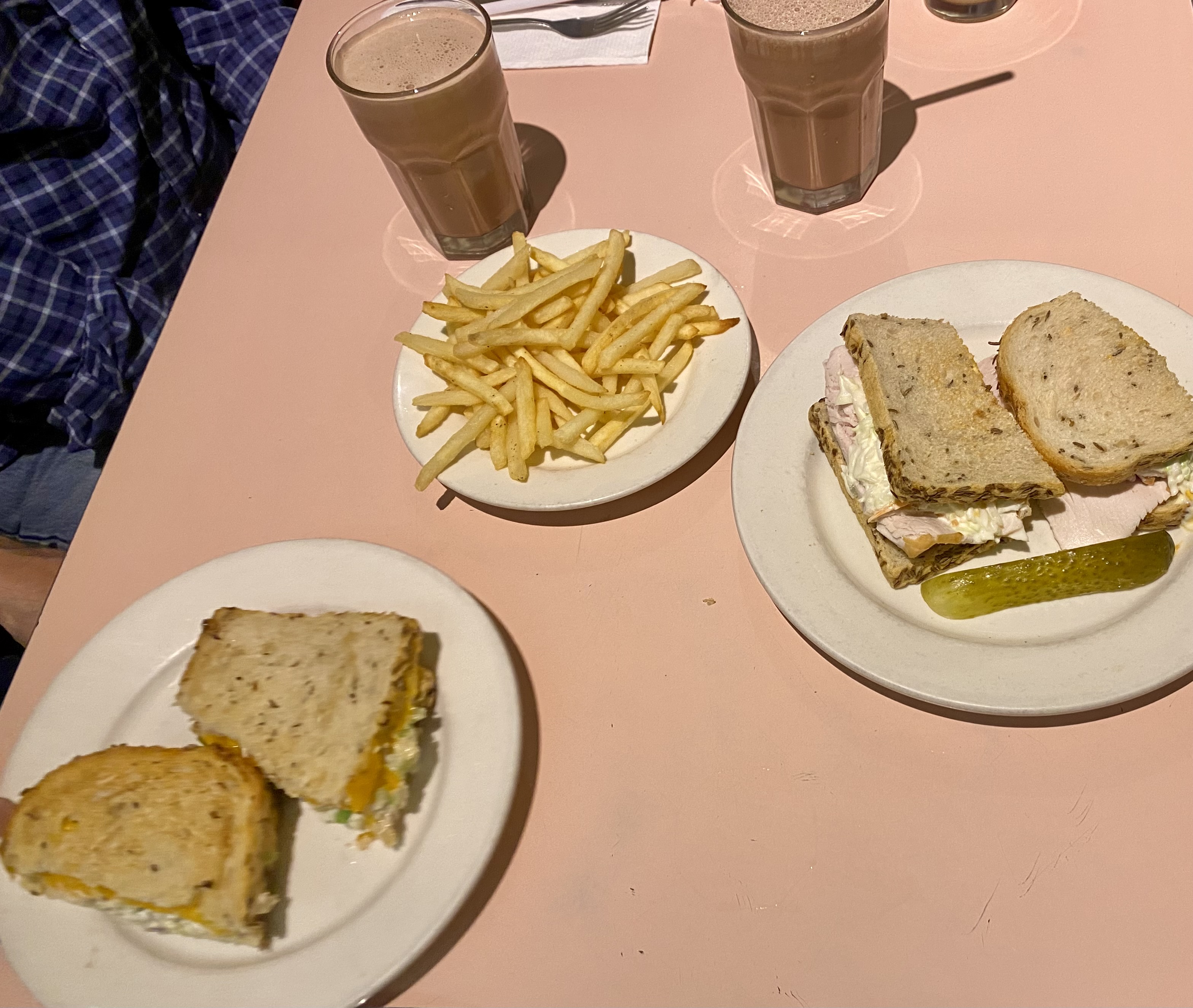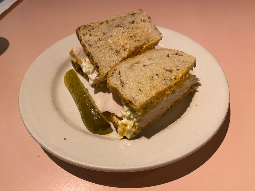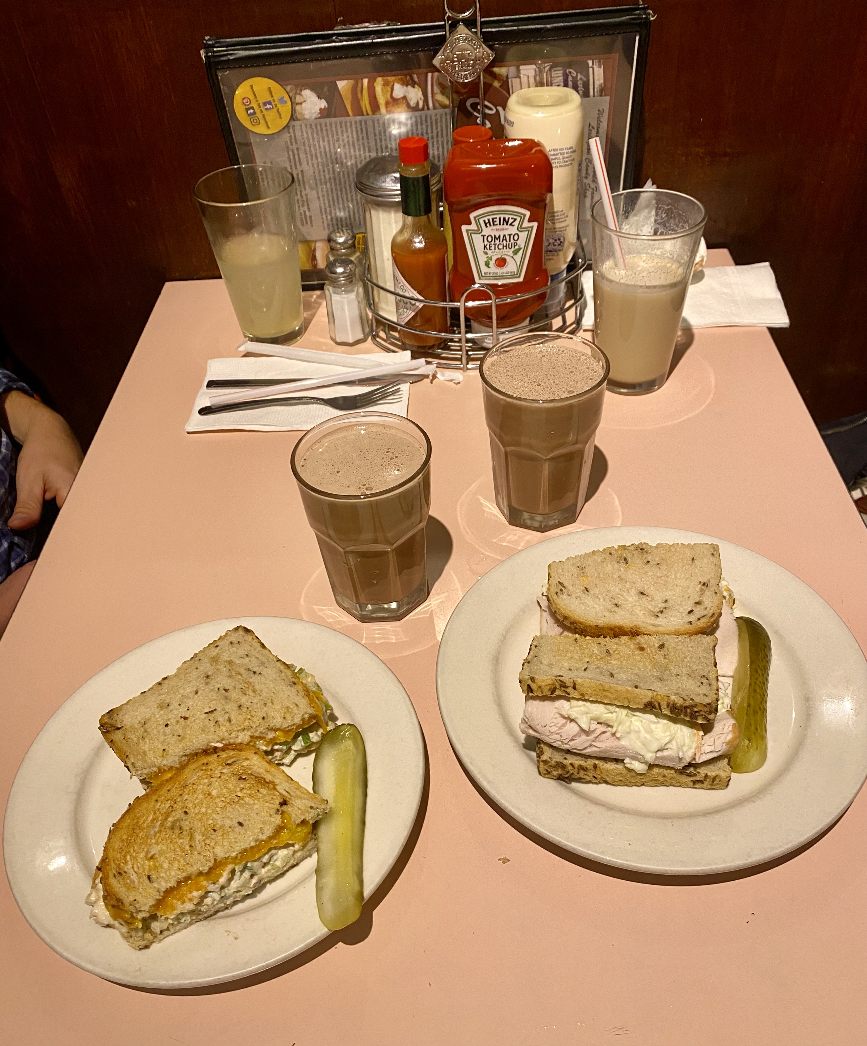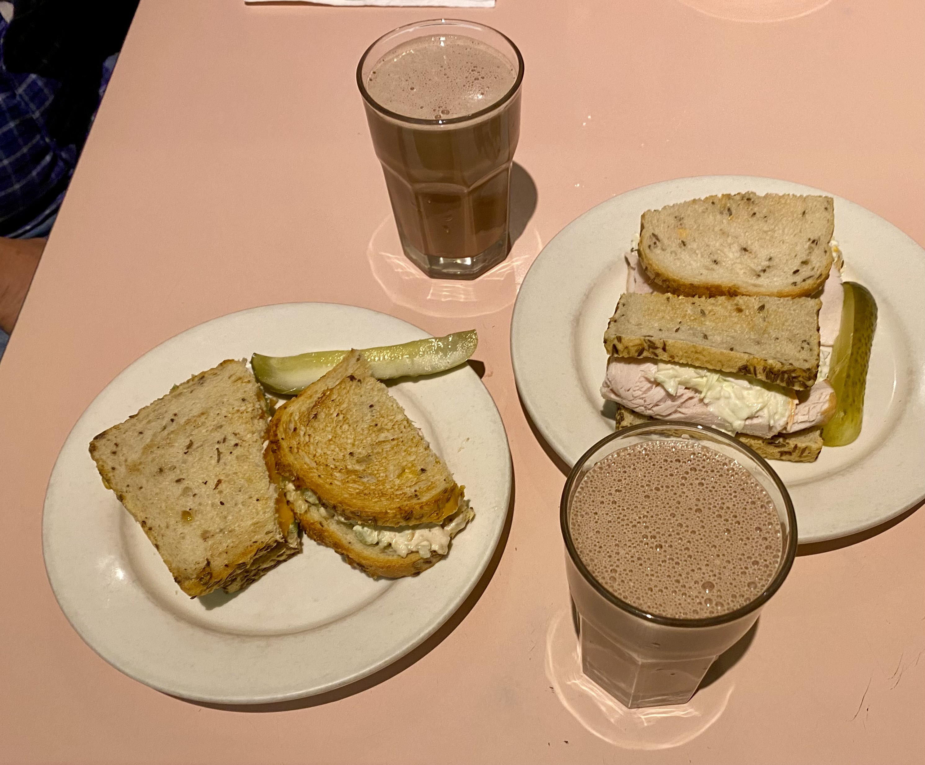 Turkey on rye with slaw and Russian. Come onnnnnn. Not an actual Rachel but Rachel-like in a most delicious way. Pickles, tuna melt, cheese burger, egg creams. Egg creams. So good. Now. In these times. Now. So good.