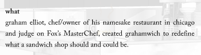And the photo I grabbed from Xoco’s website so that you might be enticed to go. Tortas are, to my knowledge, one of the lesser known sandwiches outside of their place of origin. Nice sometimes to eat something with which you have not been beaten over the head first by television.