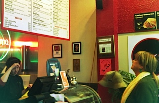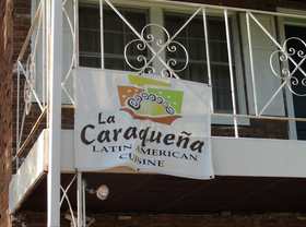 La Caraqueña is in a grievous little motel and I like that. Snugged in with white curlicue iron work. Inside, corn flour walls, ultramarine booths and a waiter with a head of hair so gorgeously black and sleek it could have been made of petroleum.