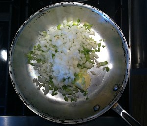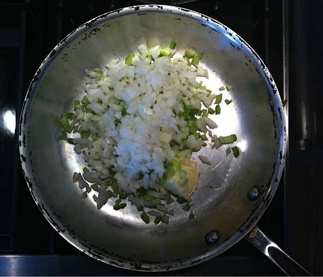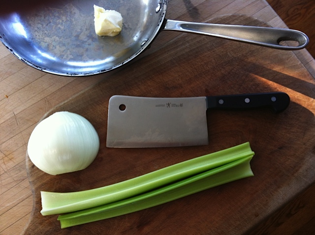 Put the butter, onion and celery into a medium sauté pan and set over low heat. Stir to coat the vegetables evenly with butter, then let cook slowly until very soft, about 10 minutes. A little browning is okay, but watch that they don’t get dark.