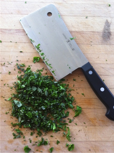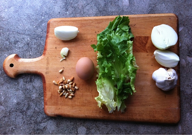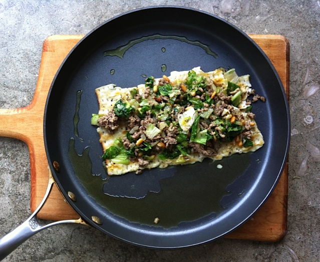 A nice option: The addition of some yellow raisins. I did not add them, but will next time. Also, the escarole could be replaced with spinach, arugula or watercress.   IMG_5628 First get out all the ingredients. IMG_5627 Put the matzo in an 8×8-inch dish and cover it with water. Let it sit. IMG_5629 Chop the onion, garlic and escarole. Turn the matzo dish sideways over the sink and gently press out the water with your hand. Try to keep the matzo intact. Pour the beaten egg over the matzo and season it with salt and pepper. IMG_5630 Put about 1 tablespoon olive oil in a small, non-stick saute pan and set over medium-high heat to warm. Add the lamb and brown it nicely, stirring with a wooden spoon to break it into little pieces. Spoon the lamb out into a bowl, turn the heat down to low and add the onions.