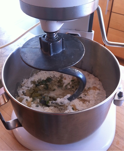 Put 4 cups white flour, 1 cup whole wheat flour, the stock mixture and the yeast mixture into the bowl of the standing mixer. Using the hook attachment, blend until a  dough begins to form. Add the remaining cup of flour and let it spin for a minute or so. The dough should be soft and not sticky.