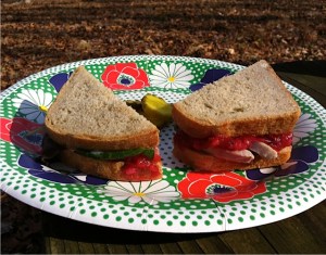 Slide the sandwich onto a board, use a serrated knife to cut it in half and eat it up. IMG_5634 IMG_5635 - Version 2 I ate (most of the sandwich) with a fork and knife, although it could be picked up easily. Fork and knife saved the laundress a bit of napkin washing. Sunny weekend lunch with panache.