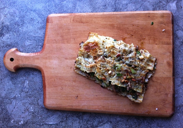 I had fun in the kitchen with this unusual – to me anyway – sandwich. I cooked. From a book. With embellishments. The original recipe calls for matzo, ground meat and onions. Plus salt and pepper and a couple other incidentals. So there was lots of room to improvise and I did. With lamb, pinenuts, escarole, garlic and… I thought of yellow raisins and will add them next time.