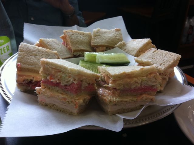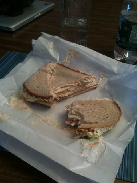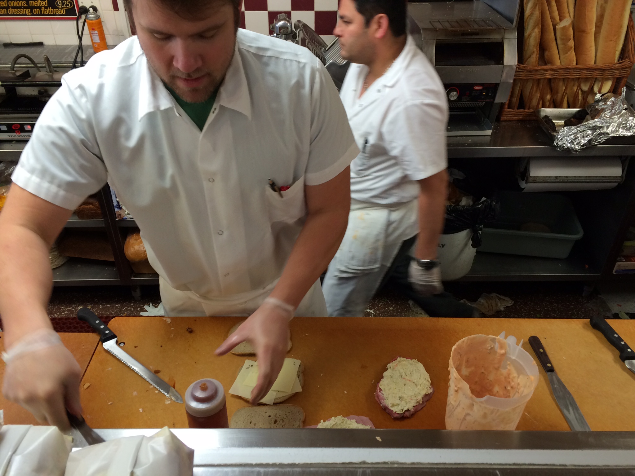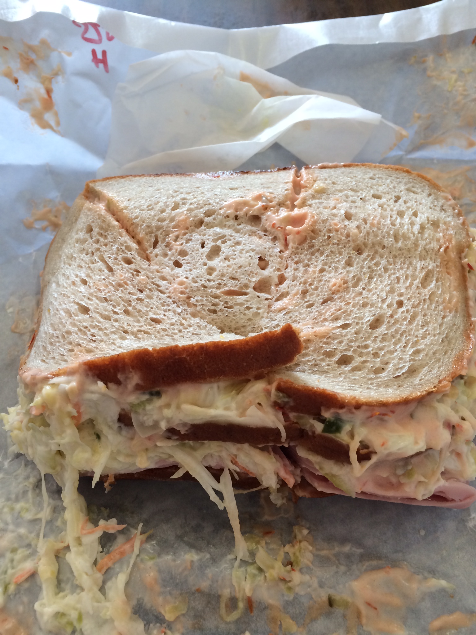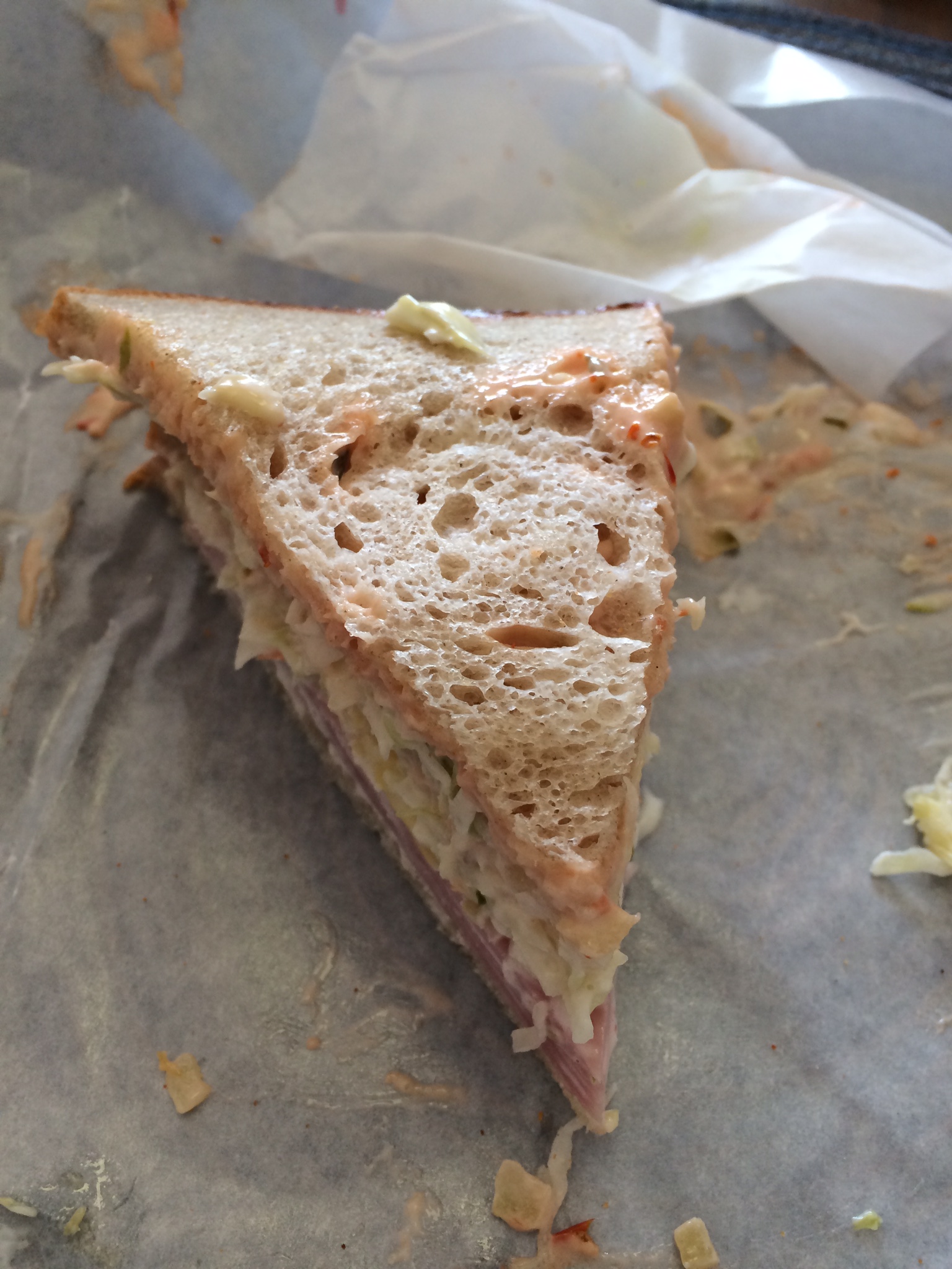 That’s 3 thin slices of rye (buttered), your choice of ham (mine), roast beef (James’), or turkey (WTF?). Swiss. Cole slaw. Russian dressing. To die for (I’m sure some have. Plus, often served when sitting shiva. Make a note for when I pass). Ta-da: