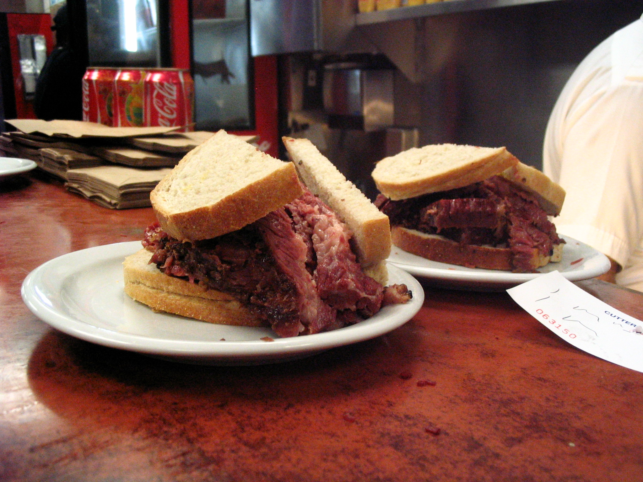 When ordering a sandwich, diners have the option of three cuts of smoked meat: lean, regular, and fat. True gourmands know that there really is no choice – the fat cut offers generous portions of gelatinous trimmings that explode on contact with your canines, offering the unique Schwartz flavor that mixes the saltiness of its herbs and spices with the smokiness of the meat juices. The regular and lean cuts progressively subtract this layer of flavor from the meat, leaving a denser though somewhat drier texture to chew on. Though there are clear health advantages to these latter cuts with respect to the clogging of one’s arteries, the reduction of the full impact of the taste explosion that is associated with the fat cut negates any of those hygienic concerns. (For the truly brave, there is an “extra-fat” cut that is off the menu but can be ordered. It is a natural extension of its fraternal cut, and the taste is literally heart-stopping.)