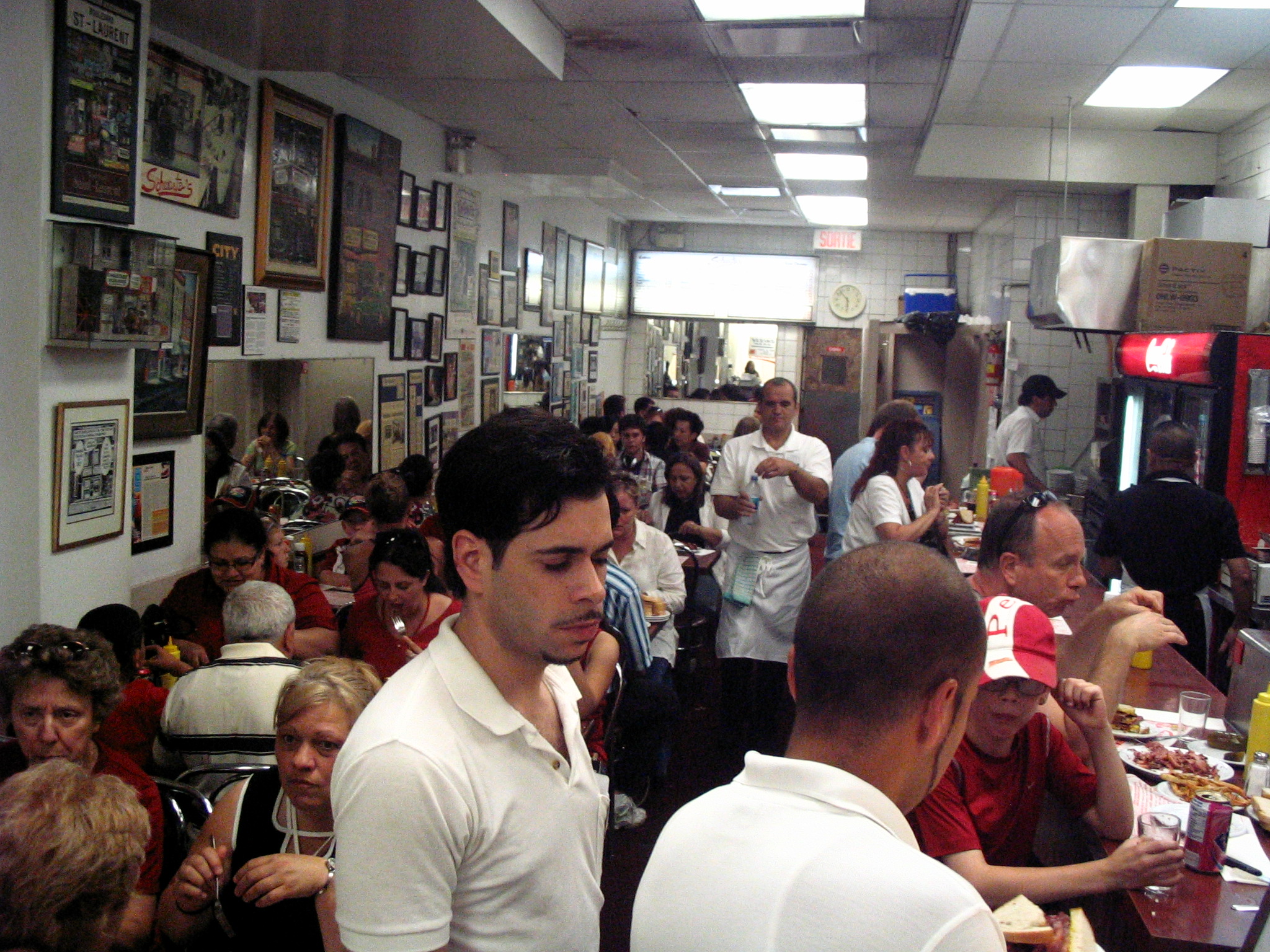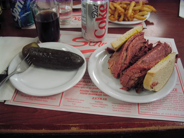A Schwartz smoked meat sandwich is typically complemented with a big sour pickle, French fries, and a carbonated drink (Coke and Black Cherry Cott are stocked in abundance). It is a fine meal at any time of the day, and one that is totally unique. I’ve eaten at other establishments that claim to offer smoked meat (or even worse, Montreal Smoked Meat) and I’ve been consistently disappointed at the pastrami and corned beef that ends up on my plate. If I want smoked meat, I go to Schwartz’s. Anything else just doesn’t make the (fat) cut.