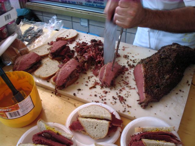 The crust of the rye bread gives shape to the sandwich, which is as big as the palm of one’s hand. The sandwich comes served bisected in two, and it is clear that the sweet spot lies in the mid-section of each half, where the meat glistens brightest in its thick juiciness. Biting into that sweet spot is a sacred event, usually delayed by connoisseurs in time for the moment juste when there are no more edges to nibble. After the teeth sink into the smoked meat, the mouth chews for several cycles to break down the flesh before letting out a pleasurable and affirmative sigh of contentment just as the precious pepper-corned juices of the meat infiltrate the taste glands. This sigh is echoed throughout the deli at different intervals by complete strangers who are forced to sit next to each other as they ultimately unite in a chorus of approval for this shared experience.
