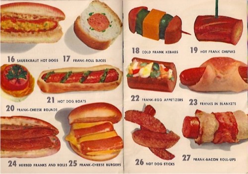 Tagged Frankfurters, Franks, Hot Dog Recipes, Sauerkraut, Vintage cookbooks