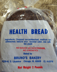 Effective as a door stop, although a tragedy to put it so low, Bruno’s Health Bread triggered a memorable bread purchasing Whole Foods encounter. Bagged loaf of “peasanty” looking bread in hand – how quaint the noble notion of a peasant – with strident slashes in the unpeasanty plastic. Cavalier comment to the clerk that the crust looked sharp, almost dangerous. “You could cut yourself on that bread!!” said the clerk. I took it home with taming on my mind.