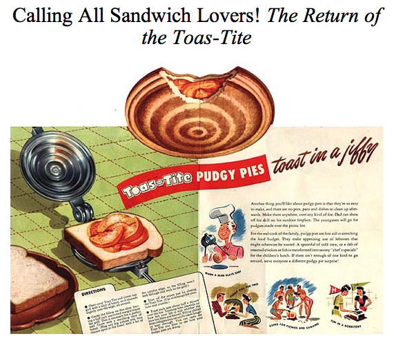 Holy Tosty, where have I been?? Didn’t know the Pudgy Pie had left us – they make a regular appearance at our camp-outs. Well, in case you’ve been mourning the Toas-Tite, rejoice! It’s renaissance is upon us.