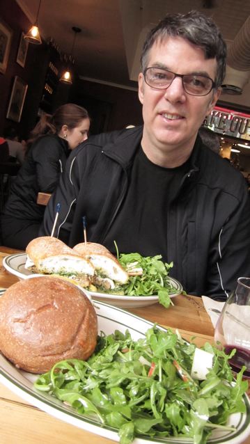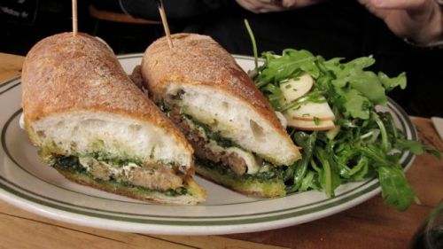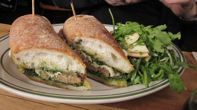 The Eric “Roscoe” Ambel (whoa, I see he has a Wikipedia entry) had a grinder with mozzarella, pork meatballs and pesto. Those meatballs look a little squished too, come to look at it. “Fantastic sandwich,” said Eric. Yup, it was.